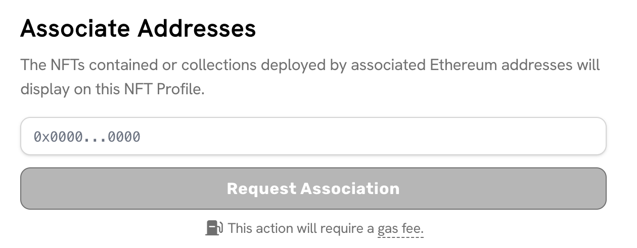 NFT Profiles display NFTs from associated on-chain addresses. Each association requires the owner to sign a transaction in order to prove control of the address. The NFT Profile can be customized to display any NFTs from associated addresses.